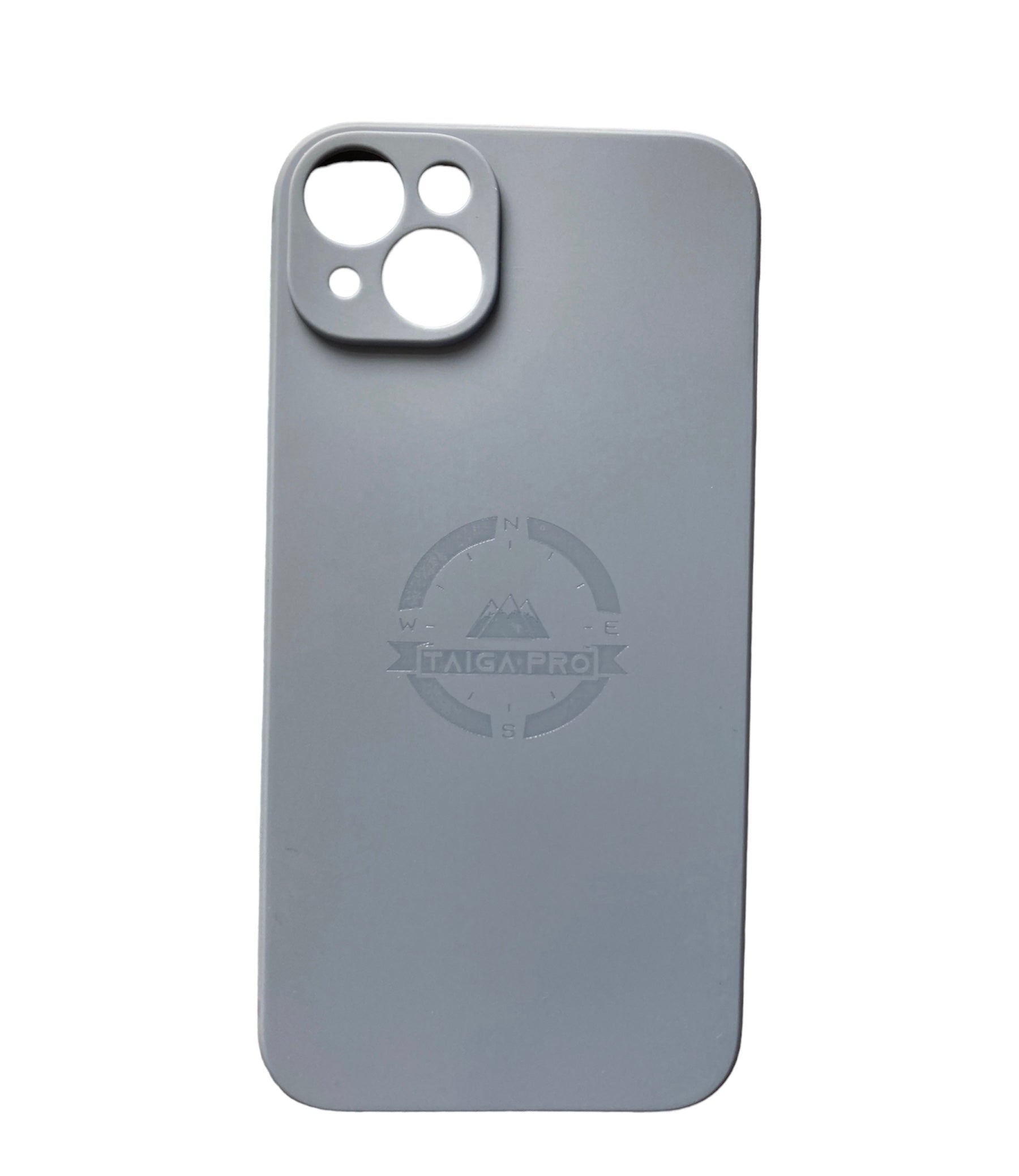 A flexible and durable black iPhone case with the Taiga Pro logo laser engraved on the back. This case is made from silicone, with a matte finish.