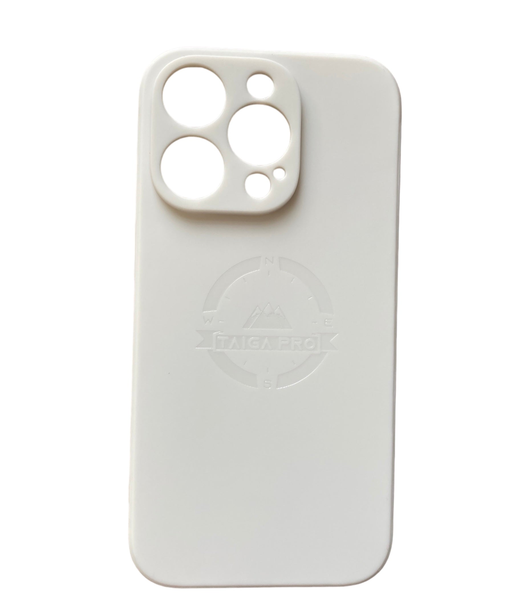 A flexible and durable white iPhone case with the Taiga Pro logo laser engraved on the back. This case is made from silicone, with a matte finish.